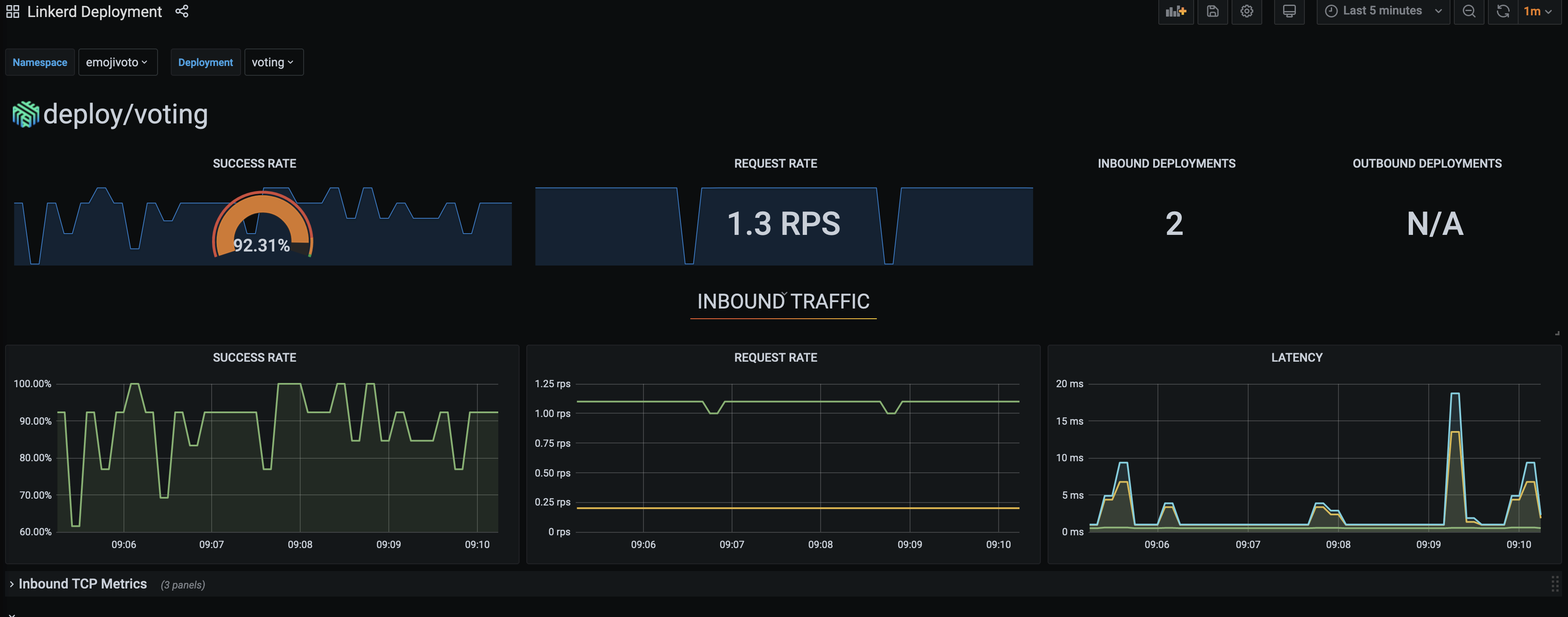 위와같이 실제 서비스 흐름도를 파악할수 있으며 자동으로 배포되는 linkerd grafana로 메트릭 확인도 가능